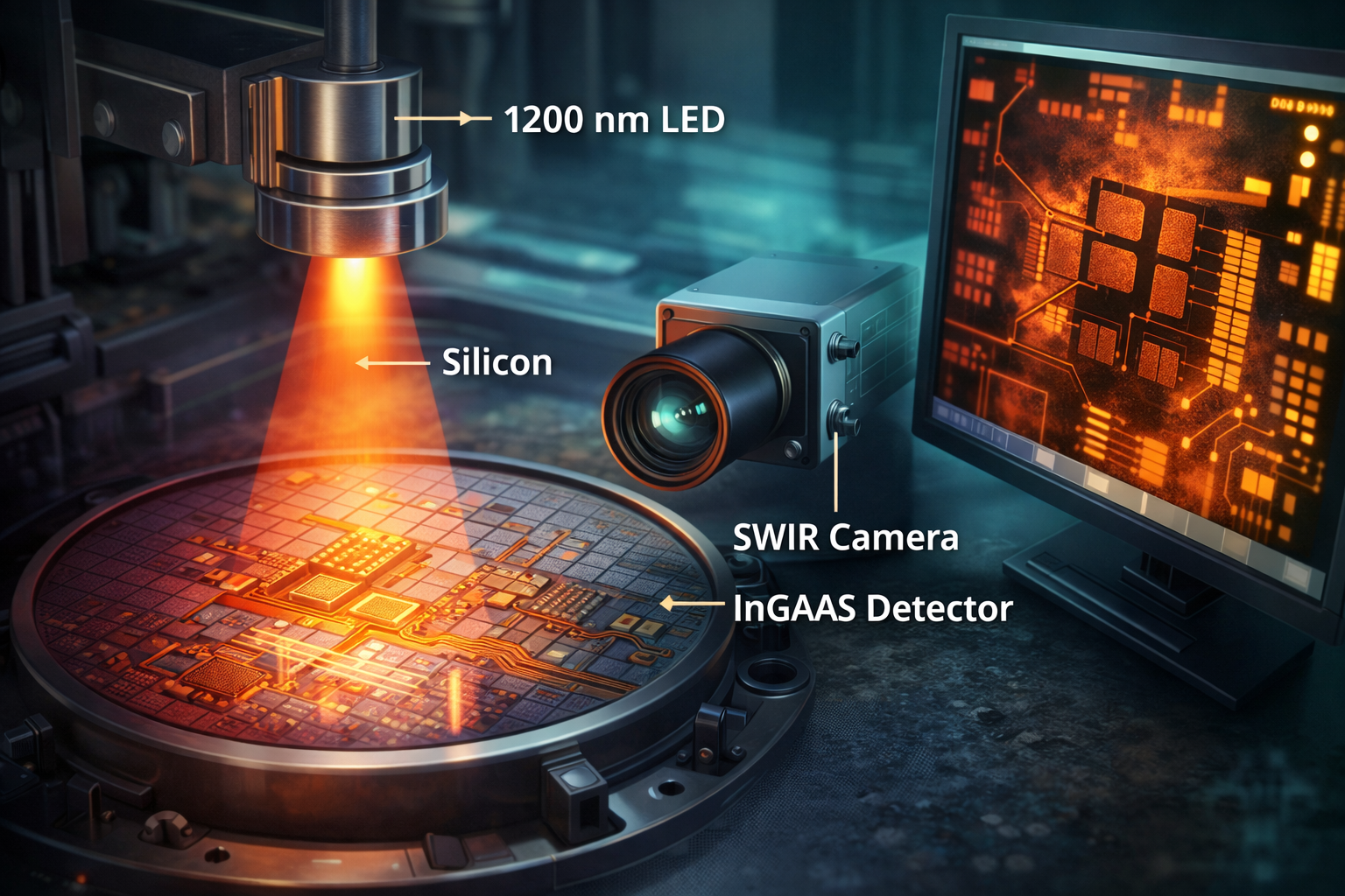 One of the prime applications of 1200 nm LED sources is in semiconductor testing and inspection, particularly for silicon integrated circuits and wafers. Since silicon is nearly opaque to visible and most near-IR light, traditional optical inspection of a silicon wafer’s subsurface is impossible with visible illumination. However, at wavelengths around or above 1100 nm, silicon suddenly becomes transparent. By 1200 nm, a standard silicon wafer allows IR light to pass through relatively easily. This property is exploited in semiconductor failure analysis and wafer inspection: by illuminating a chip from the backside or through the wafer with 1200 nm infrared light, inspectors can image internal features like circuitry patterns, alignment marks, or defects that lie beneath the surface. SWIR cameras with InGaAs sensors can capture these transmitted or reflected IR images, revealing cracks, voids, or contamination inside the silicon that would be hidden at shorter wavelengths.