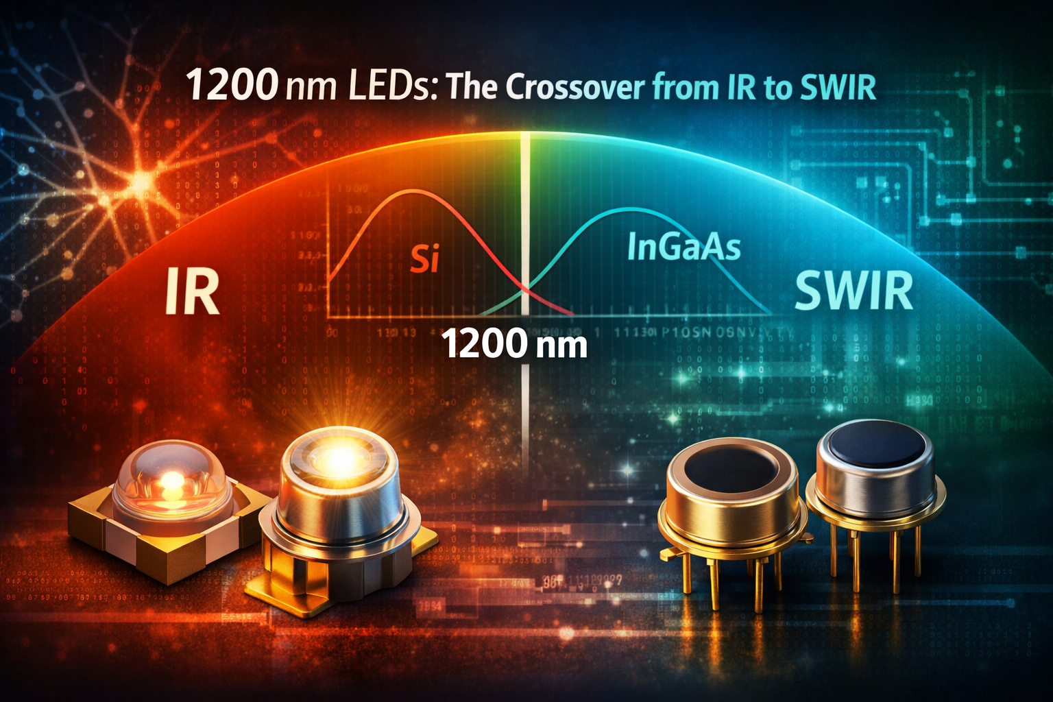 Short-wave infrared (SWIR) LEDs around 1200 nm represent a pivotal transition point between traditional infrared and the deeper SWIR region. This article explores what makes the 1200 nm wavelength special, how photodiode detectors behave at this crossover, and why engineers often choose LED emitters over lasers at 1200 nm. We delve into the semiconductor technology behind 1200nm LEDs,…